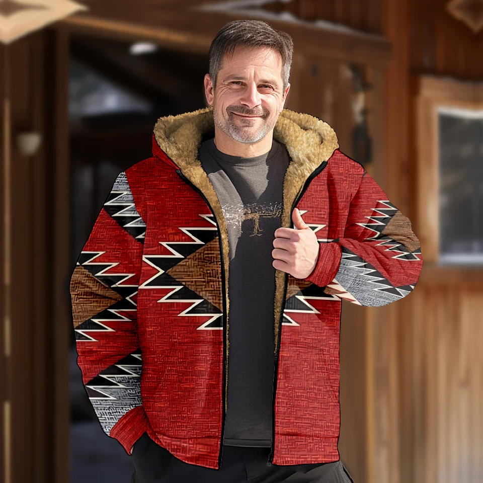 Blouson polaire homme rouge avec motifs géométriques et capuche