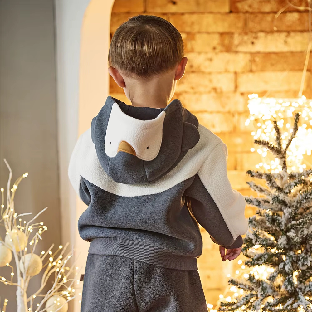 La polaire enfant design pingouin apporte une chaleur agréable grâce à sa matière en polyester doux. Sa capuche intégrée renforce la protection lors des journées fraîches. Le contraste blanc et gris met en valeur un pingouin ludique qui séduit immédiatement les enfants.